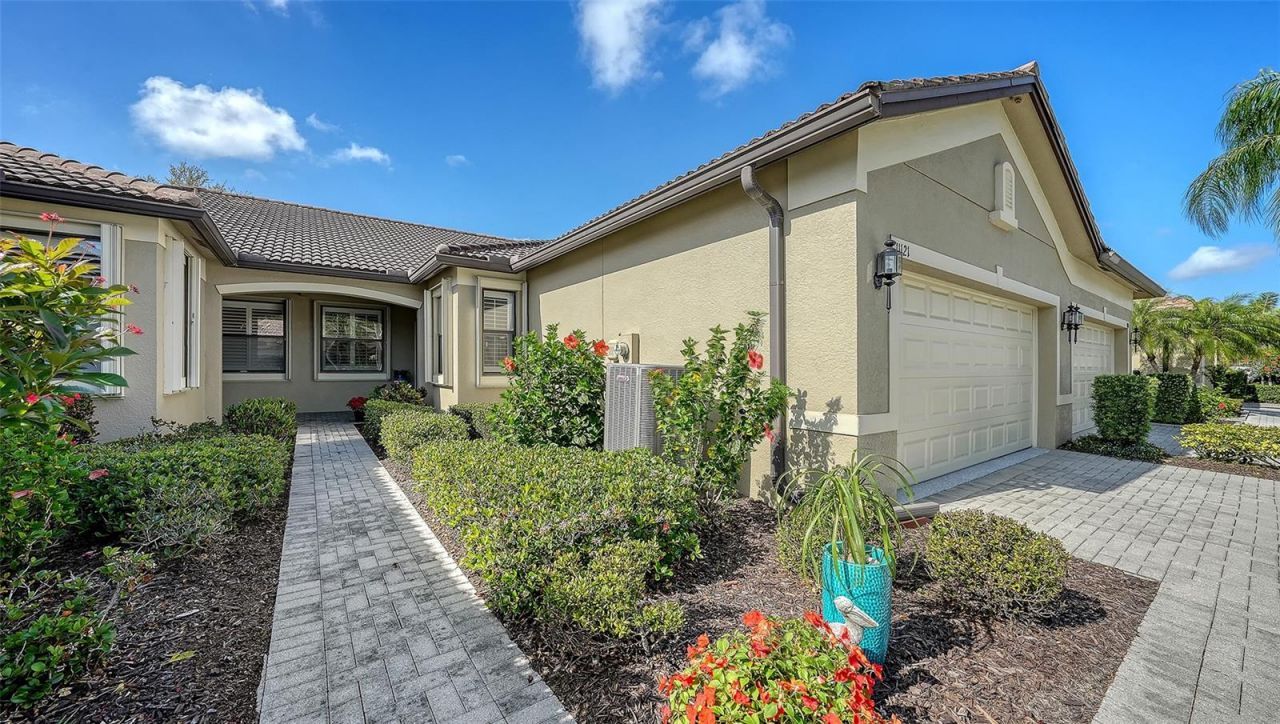 Peaceful, easy living in the resort-style community of Venetian Falls. Beautifully maintained 2-bed + den attached villa with sparkling LAKE views. An inviting open floorplan designed for comfort and effortless living. Glass and screen storm door at entry. Tile flooring throughout the main living areas and engineered hardwood in the bedrooms. Stylish plantation shutters and easy to use accordion hurricane shutters. Two-car attached garage with epoxy-coated flooring, workbench, storage cabinets plus drop down shelving. Stone paver driveway, walkway and lanai. Well-appointed kitchen with granite countertops, breakfast bar, solid wood cabinetry, pantry closet and Whirlpool stainless steel appliances. Versatile den with French doors provides space for a home office, media room, or additional guest accommodations. Primary suite with large walk-in closet and ensuite bath featuring dual vanity and walk-in shower. Both bathrooms have Corian countertops. in-unit LG washer and dryer. Freshly painted throughout Spring 2025. Extended lanai with serene lake views and enhanced with no-see-um screens, ideal for year-round enjoyment. You will love watching several varieties of Florida birds and wildlife everyday around the lake. Venetian Falls offers an exceptional lifestyle with a 16,000 SF clubhouse featuring a grand ballroom, fitness center, billiards room, craft and card rooms, internet caf?, and meeting spaces. Residents enjoy a heated lap pool and spa, resistance walking pool, bocce ball courts, a 9-hole putting green, and scenic walking and biking paths throughout the community. A full-time activity director ensures a vibrant social calendar, while on-site management provides added convenience. The reasonable HOA fee includes lawn maintenance, trimming, mulching, irrigation, cable TV, internet, exterior paint scheduling, and roof power washing-allowing for truly low-maintenance living with reasonable fees. Ideally located just minutes from Wellen Park and historic downtown Venice for shopping, dining, entertainment, everyday conveniences, and the beautiful Gulf beaches.