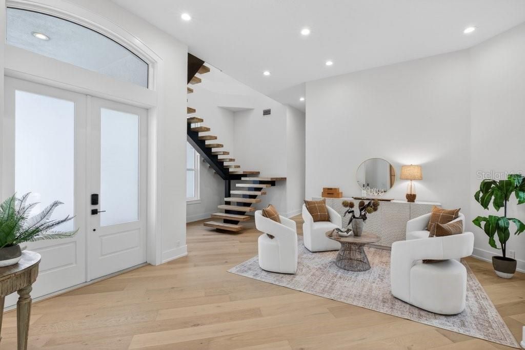 COASTAL MODERN PERFECTION | Steps from the Atlantic in Grand Mer, Hammock Dunes Experience the pinnacle of beachfront living in this masterfully re-imagined estate, located in the most prestigious Grand Mer neighborhood on the northeast corner of the gated Hammock Dunes community. Situated at the end of a quiet cul-de-sac and positioned within an enclave of exquisite oceanfront homes, this residence offers the ultimate luxury - your feet in the sand within a two-minute stroll from your front door. THE TRANSFORMATION - Following a $1M+ comprehensive renovation, every inch of this home has been curated with the savvy details of a Ritz Carlton residence. From the 2018 tile roof down to the brand-new white oak flooring, the home radiates a Modern Coastal flair that balances sophistication with livability. The heart of the home is a chef's dream featuring custom white oak cabinetry and an oversized prep island. Professional appliances include a 48 refrigerator, 8-burner gas range, and integrated beverage center and a massive hidden walk-in pantry designed for the ultimate host. SEAMLESS FLOW - The open-concept great room features a modern 3 sided electric fireplace and 12' sliding glass doors that flood the space with natural light. SOPHISTICATED ACCOMMODATIONS - Designed for multi-generational comfort or grand-scale entertaining, the layout maximizes every square foot. Dual primary suites - A luxurious primary retreat on the main level plus a second primary suite upstairs featuring an ocean-view balcony and a walk-in closet plumbed for secondary laundry. Five full & two half baths are updated with designer finishes. WORK OR PLAY - A versatile second-floor bonus space with two private balconies and a quiet home office. OUTDOOR OASIS - The lanai serves as a private resort, featuring an open-air saltwater pool and spa, a fully-equipped summer kitchen, and retractable hurricane panels for effortless security and lock-and-leave peace of mind. RARE QUALITY AND PEACE OF MIND - Construction - high-quality build in an X Flood Zone. PROTECTION - Full hurricane impact windows and doors throughout. THE CLUB - Membership to the Platinum-rated Hammock Dunes Club is available, offering world-class golf and oceanfront amenities just steps away.